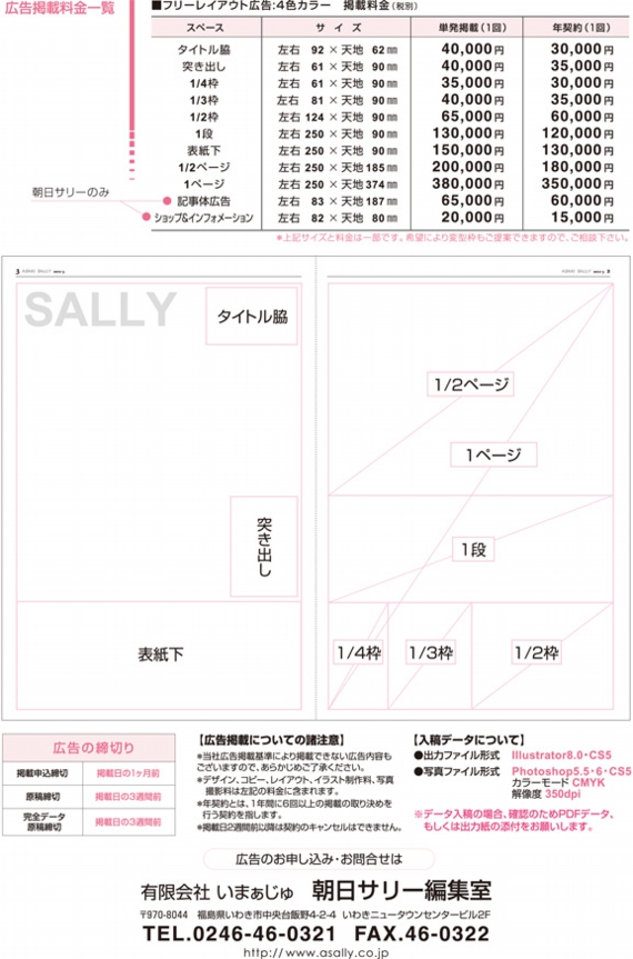 「朝日SALLY」は朝日新聞のミニコミ誌として、いわきの生活情報を1988年より編集・出版し、25年以上の実績があります。月2回発行して欲しいという読者やクライアントの声を反映し、新たに「シニア朝日サリイ」を平成15年4月創刊。しかし、「シニア」というくくりは、読者層が限定されてしまいがち。もっと多くの方に読んでいただきたいと、平成17年3月より、誌名を「スロー朝日サリイ」と改称しました。震災以降は被災地を応援する情報を主に掲載。地域に密着する姿勢を認められ、経済産業省後援の「ARUNO AWARD」では「地域密着部門賞」を受賞しました。