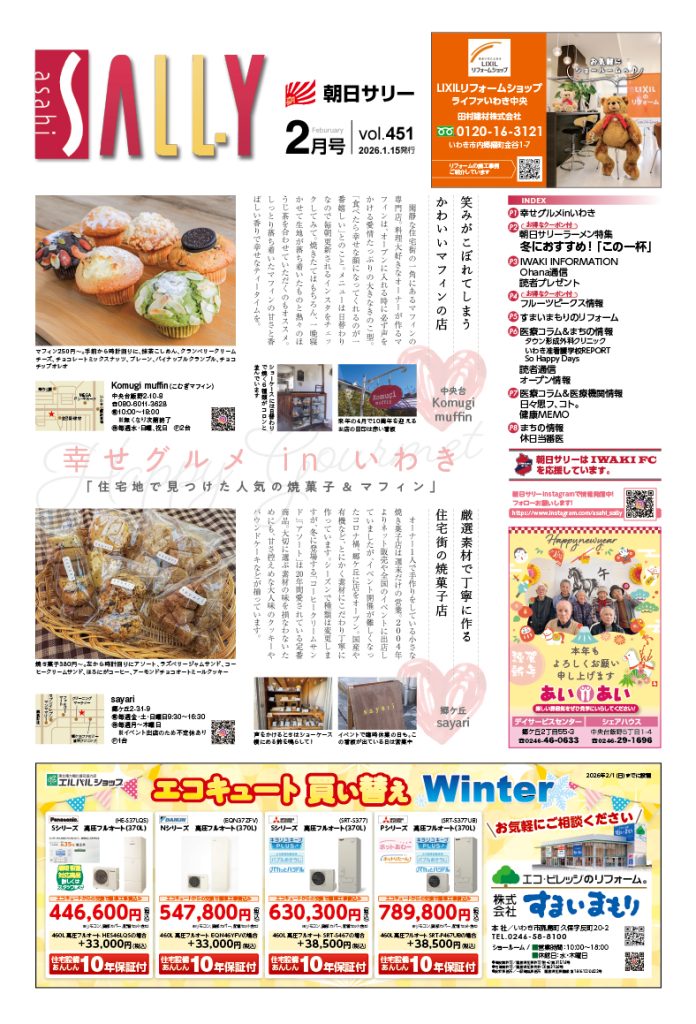 平成28年2月より二誌を合併し、新「朝日サリイ」(その後「朝日サリー」に改称)が誕生しました。「街と暮らしを楽しむ生活情報」と「食と体を見つめる健康情報」の二つを毎月15日に発行してまいりましたが、コロナ禍、円安などの煽りを受け、原材料費が高騰。紙離れも加速したことから、二つの情報誌を合体し、令和8年2月号より8ページの朝日サリーとしてリニューアルしました。