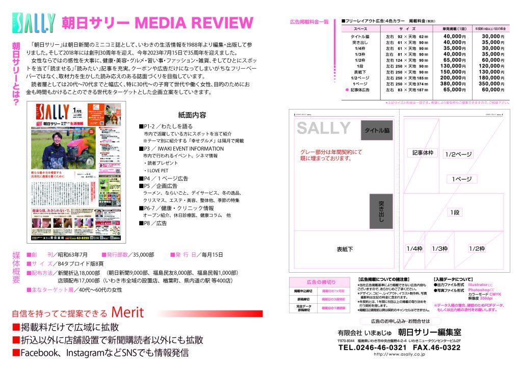 「朝日SALLY」は朝日新聞のミニコミ誌として、いわきの生活情報を1988年より編集・出版し、35年以上の実績があります。月2回発行して欲しいという読者やクライアントの声を反映し、新たに「シニア朝日サリイ」を平成15年4月創刊。しかし、「シニア」というくくりは、読者層が限定されてしまいがち。もっと多くの方に読んでいただきたいと、平成17年3月より、誌名を「スロー朝日サリイ」と改称しました。震災以降は被災地を応援する情報を主に掲載。地域に密着する姿勢を認められ、経済産業省後援の「ARUNO AWARD」では「地域密着部門賞」を受賞しました。